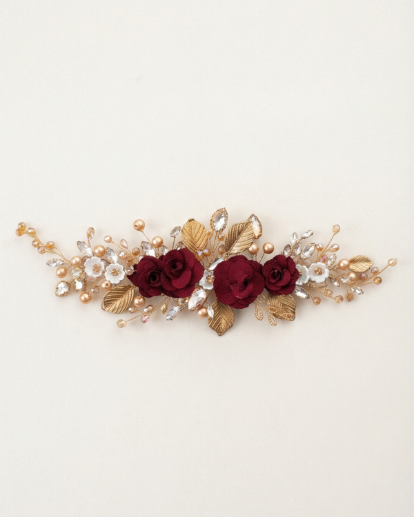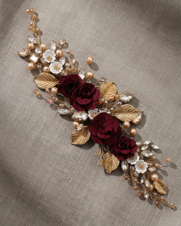 Bold yet elegant, this floral hair piece features deep burgundy fabric roses at the center, accented with soft ivory blossoms, champagne pearls, and clear faceted crystals. Gold-tone leaves and delicate wired branches extend outward, creating a graceful vine silhouette with balanced dimension and texture.
