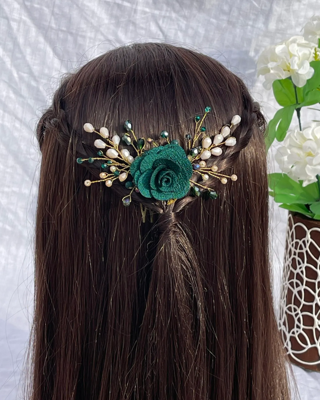 - Elegant Floral Design: Comb pin featuring a black flower with white and black crystals on golden wire