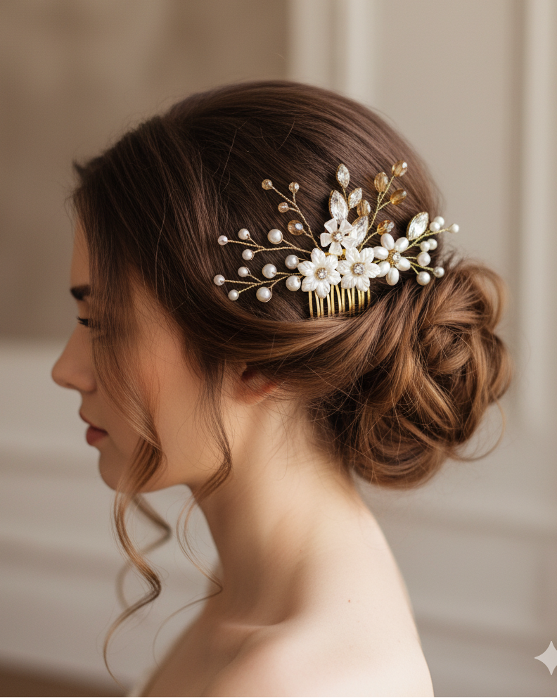 • Secure & Comfortable: Sturdy gold comb ensures it stays in place, whether in an elegant bun or romantic half-up style