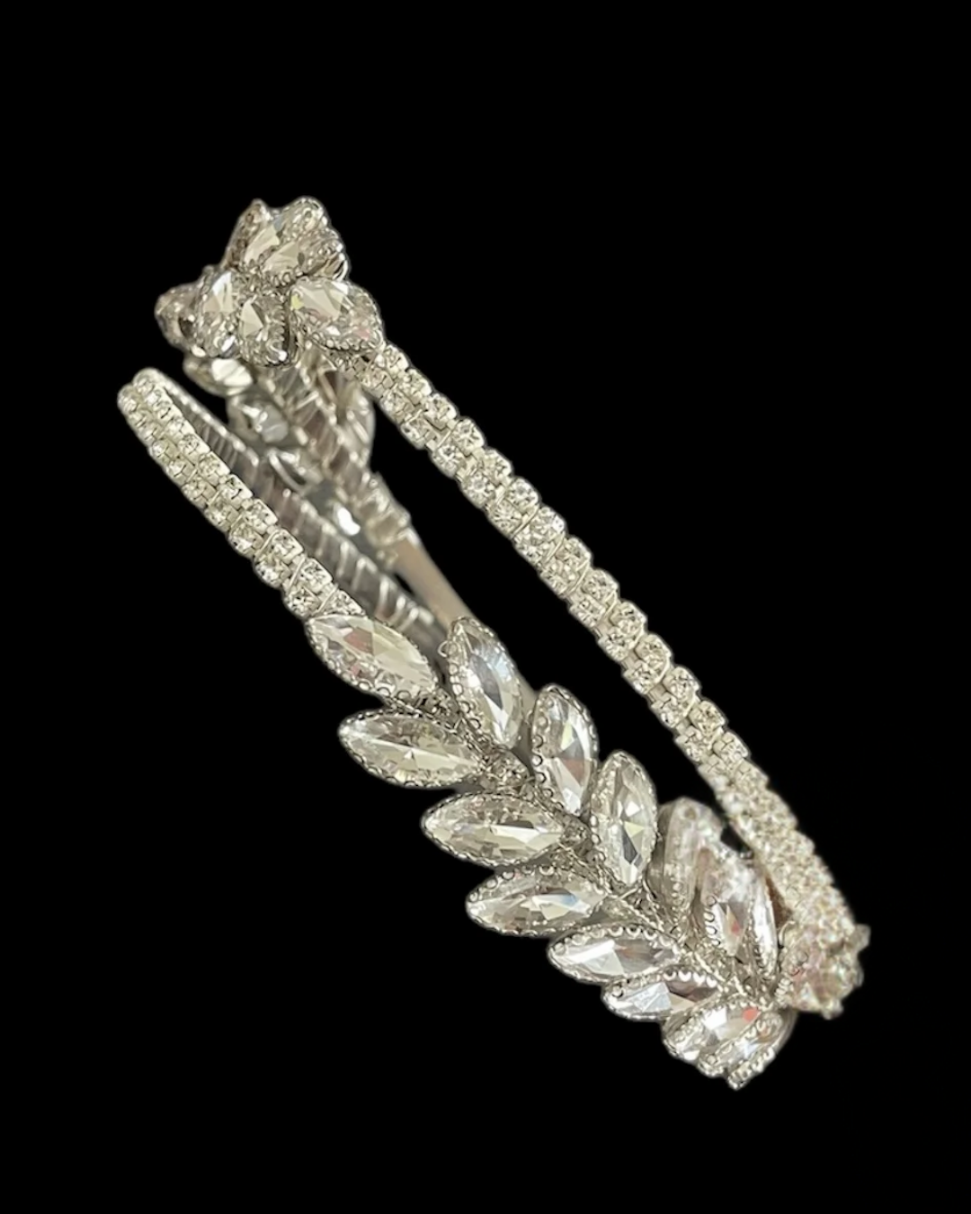 - Double Headband: Features two bands adorned with silver rhinestones and silver wire for an elegant look.