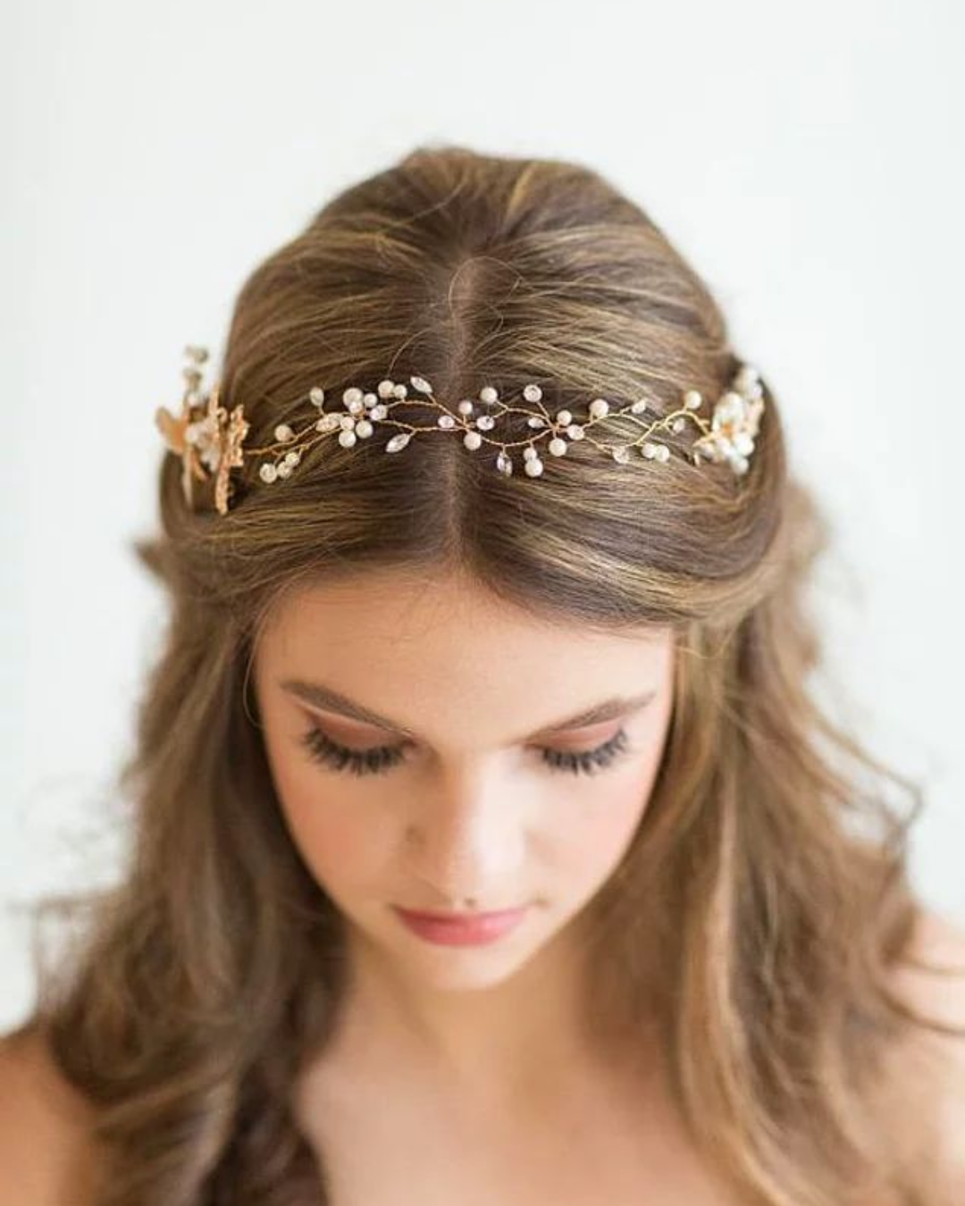 - Elegant & Timeless: Delicately handcrafted hair vine with golden wire, white pearls, rhinestones, and golden leaves