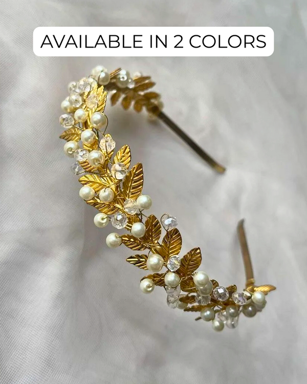 - Elegant & Timeless: Headband 08 available in Silver and Gold, adorned with pearls, crystals, and delicate leaves