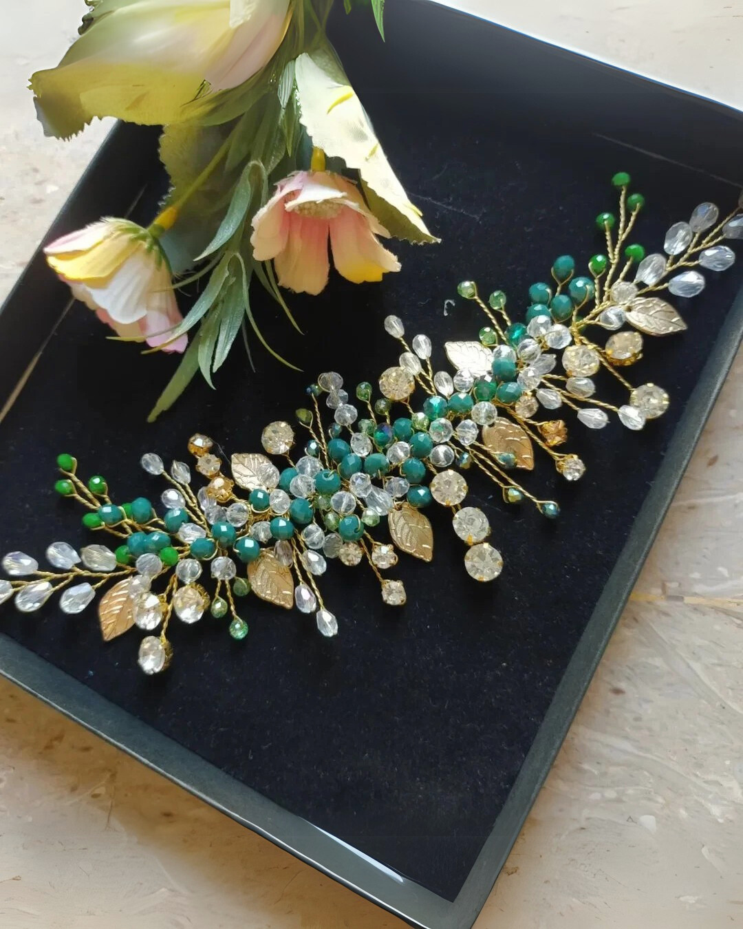 • Gray Crystal & Golden Leaf Headpiece: A graceful headpiece featuring gray crystals, golden leaves, and transparent crystals — designed to add elegance and charm to any hairstyle.
