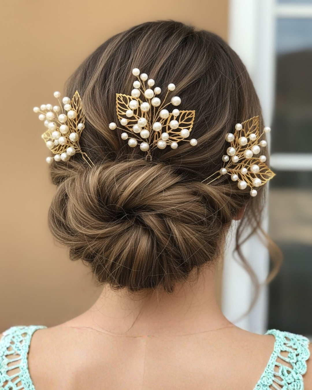 Introducing our Set of Pins, perfect for sophisticated hairstyles. The set includes three elegant golden hair pins featuring delicate white pearls and intricate golden leaves. Add a touch of glamour and class to your look with these beautiful and versatile accessories.