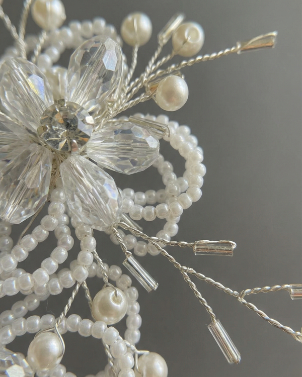 Intricate and luminous, this floral side hair piece features iridescent crystal petals paired with delicate pearl beadwork arranged in soft looped patterns. Fine silver wire branches extend outward with pearl and crystal accents, creating dimension and graceful movement.