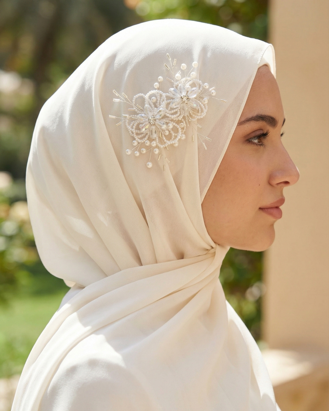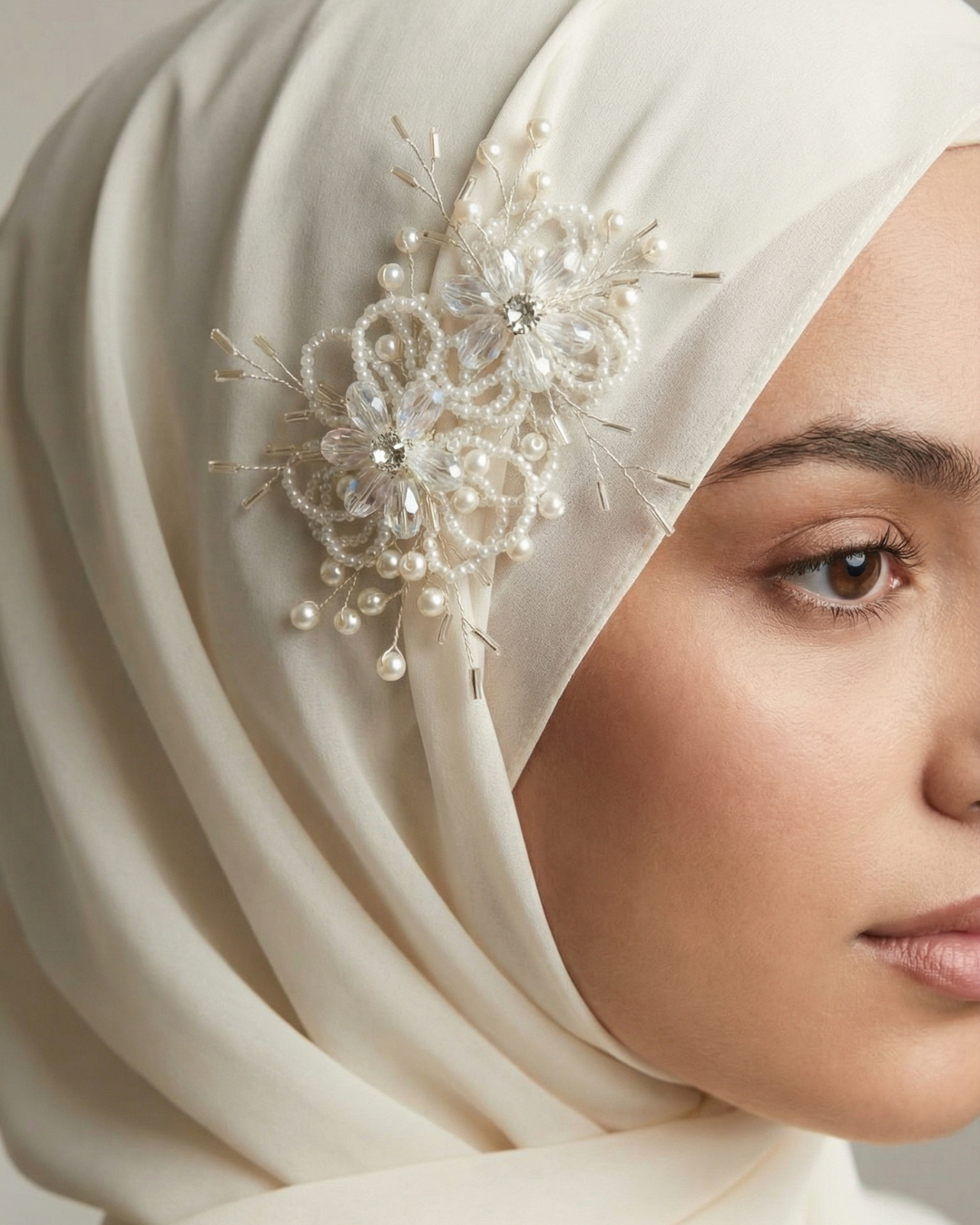Designed as a versatile statement accessory, it can be styled elegantly on a hijab or secured into hair for side placement above a bun or loose waves. Lightweight yet eye-catching, it adds refined sparkle without overpowering the overall look.