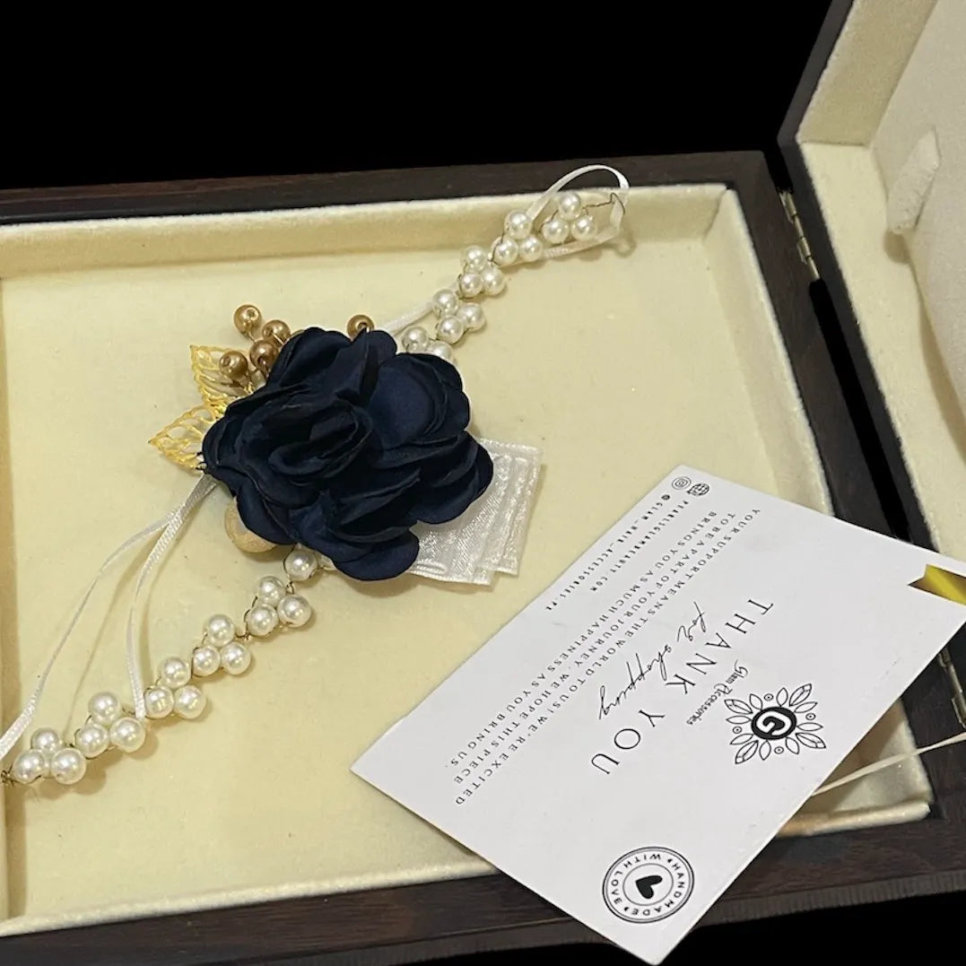 • Elegant & Stylish: Wristband featuring blue and black fabric flowers for a bold and chic look
